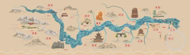 展开地图正面,一幅生动的长江流域图跃然眼前:13个省区市的地标建筑被细腻勾勒——从青海的塔尔寺、重庆的洪崖洞、湖北的黄鹤楼、江西的滕王阁,到南京长江大桥、上海东方明珠塔,每一处都是地域文化的缩影。